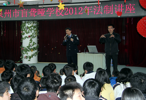 3月31日下午,泉州市盲聾啞學校邀請泉州市公安局陳建煌警官蒞校作法制教育專題講座。陳警官針對新時期青少年犯罪現狀、特點與原因,結合發人深省的案例,對什么是犯罪、容易誘發犯罪的種種因素進行了深入的剖析,就青少年如何自我防范和自我保護等方面作了精辟的講解。