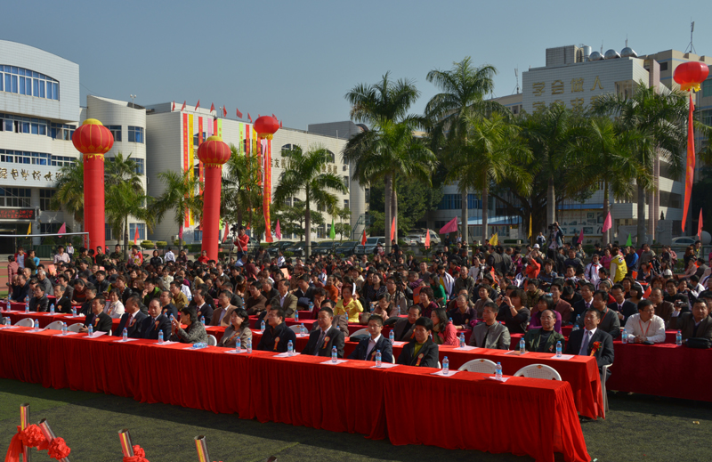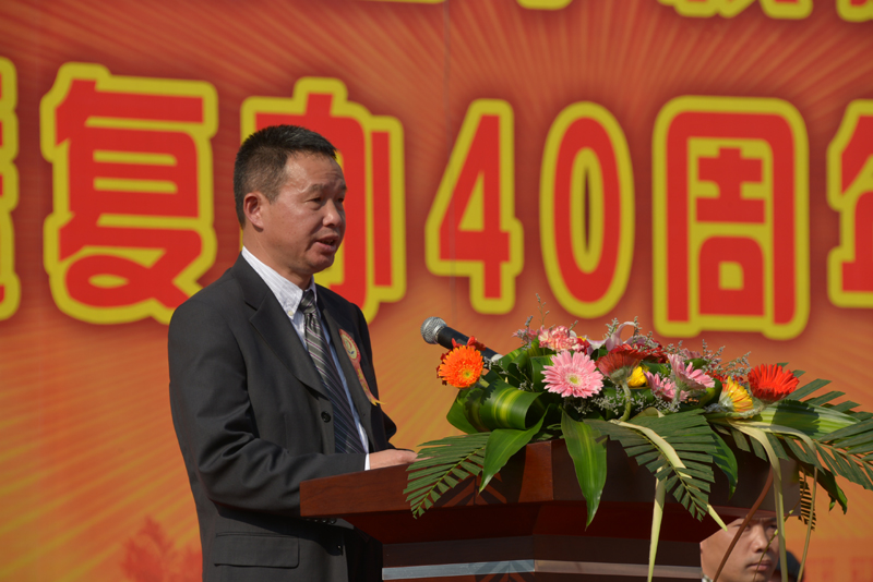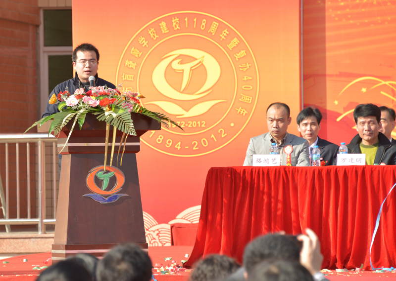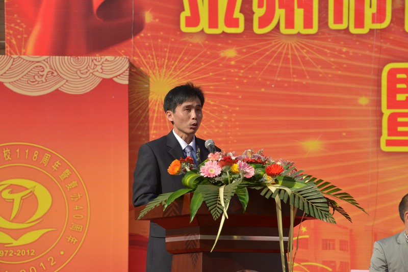 蔡景燦校長獻詞,他代表學校向蒞臨大會的各位領導、嘉賓表示熱烈的歡迎!向關心支持幫助我校的各界朋友表示衷心的感謝!向為學校作出貢獻的全體師生員工、離退休人員表示崇高的敬意!