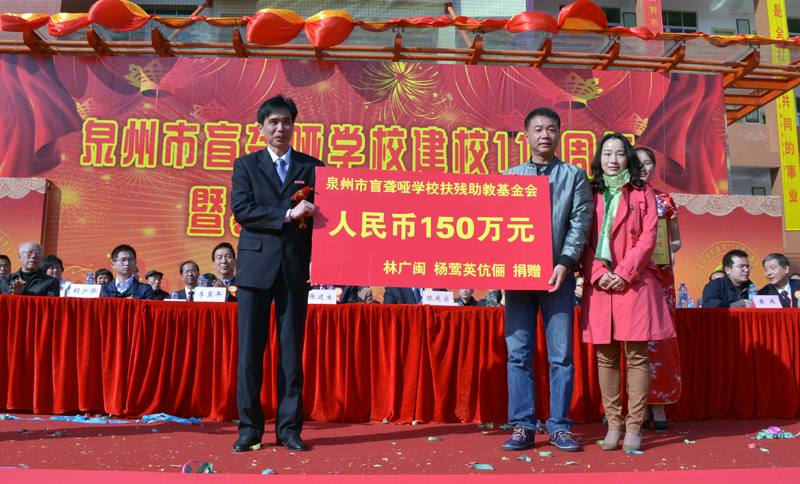大會舉行了捐贈儀式。知名企業家林廣閩、楊鶯英伉儷每年出資30萬元,連續五年,累計共150萬元,為泉州市盲聾啞學校建立了扶殘助教基金會。