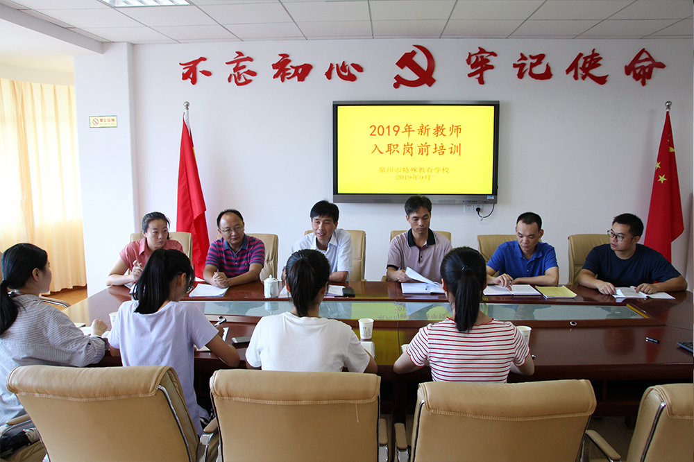 為幫助新入職教師盡快適應泉州市特殊教育學校教師工作崗位,結合學校新入職教師實際情況和專業成長要求,以及學校實際情況,經學校研究,于2019年9月5日對新入職教師進行為期一天的入職崗前培訓。